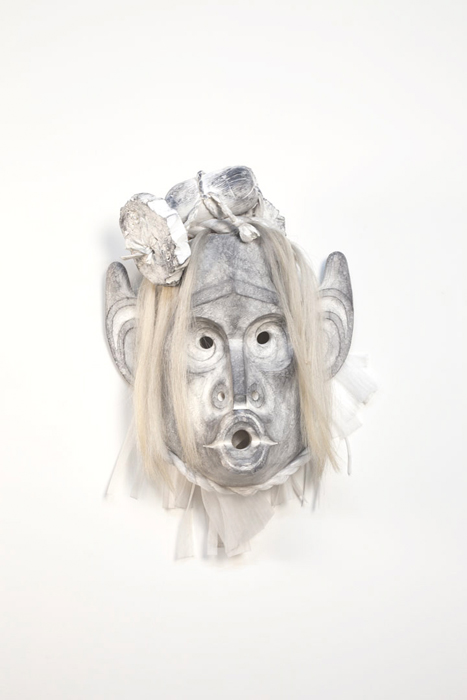 On the facing wall of the gallery, a monumental mask of Tsonoqua, the giant ogress with hair covering her dark face looks out. Known for stealing children, and carrying them off in a basket on her back to eat in her lair in the deep woods, she is characterized by dark tufted hair, eyebrows, facial hair, her deep hollow eye sockets and protruding lips. Tsonoqua’s eyes are heavy, appearing to be half asleep while she howls. As earrings, she wears the heads of two small children.