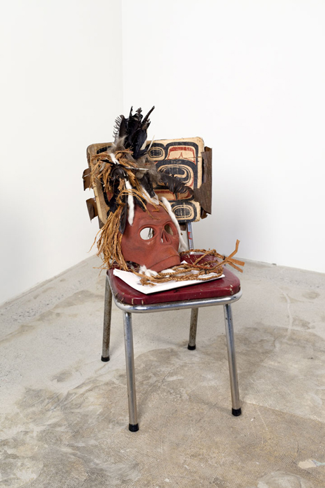 This series of masks and ritual knowledge are owned by Beau’s family, passed down from generation to generation. They are made roughly, and are worn in a dancing series for four years only, then burned. This grouping is nearing the end of its cycle, and midway through the exhibition the 40 Atlakim masks will be taken to Alert Bay to be danced one final time at a Potlatch, and then destroyed. A new set will be carved only to go through the same cycle, and so on.