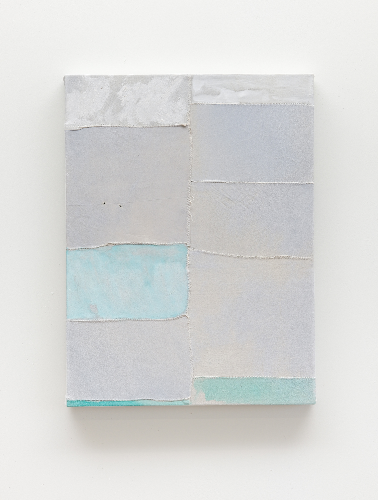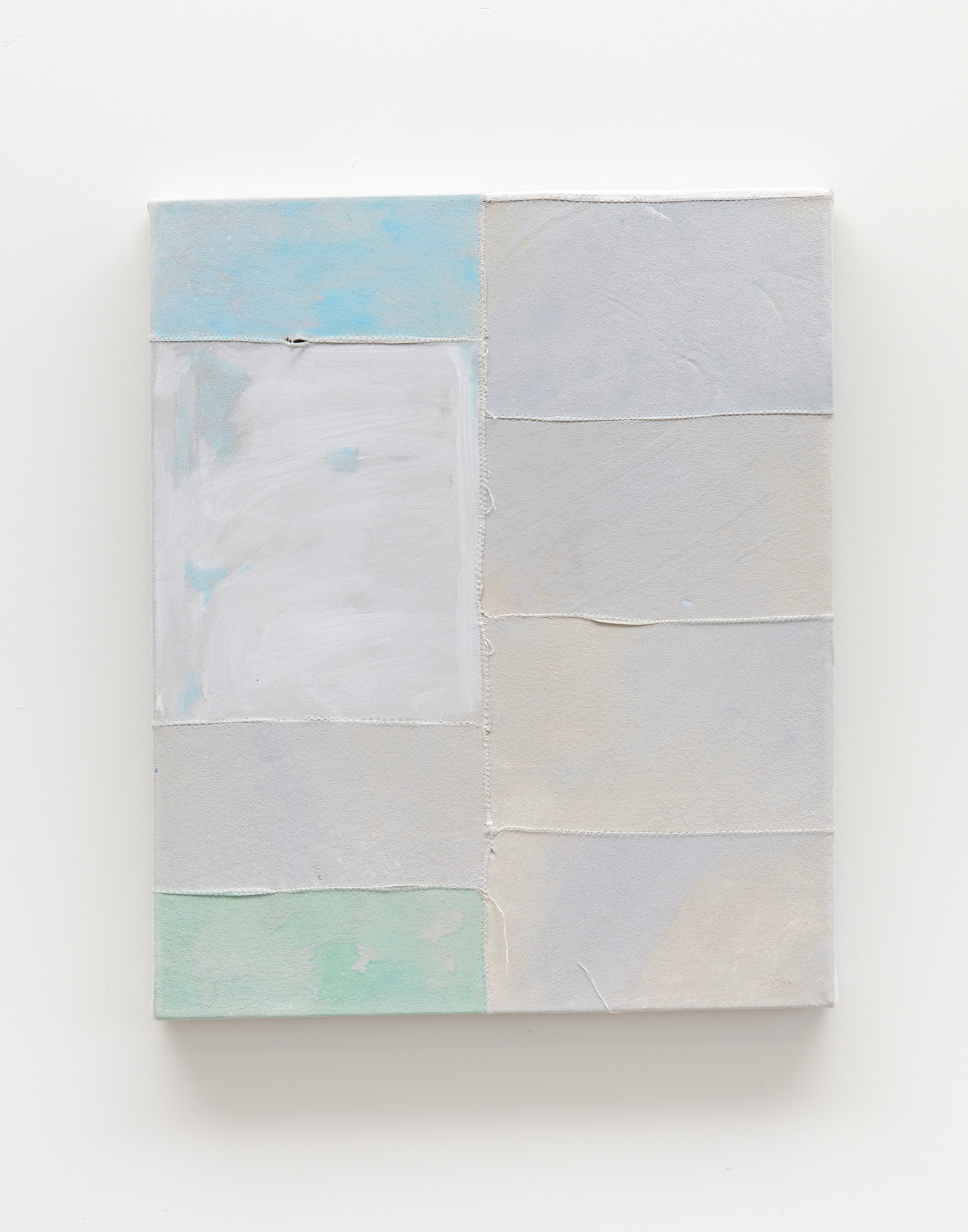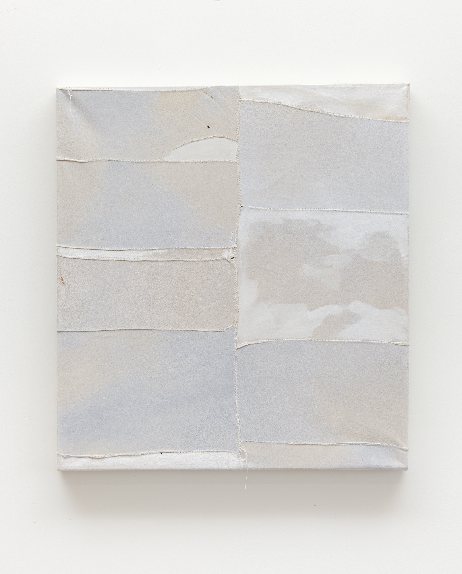 Watercolour, gouache, rice paste, wax emulsion, and pigment on found chamois suede patchwork,