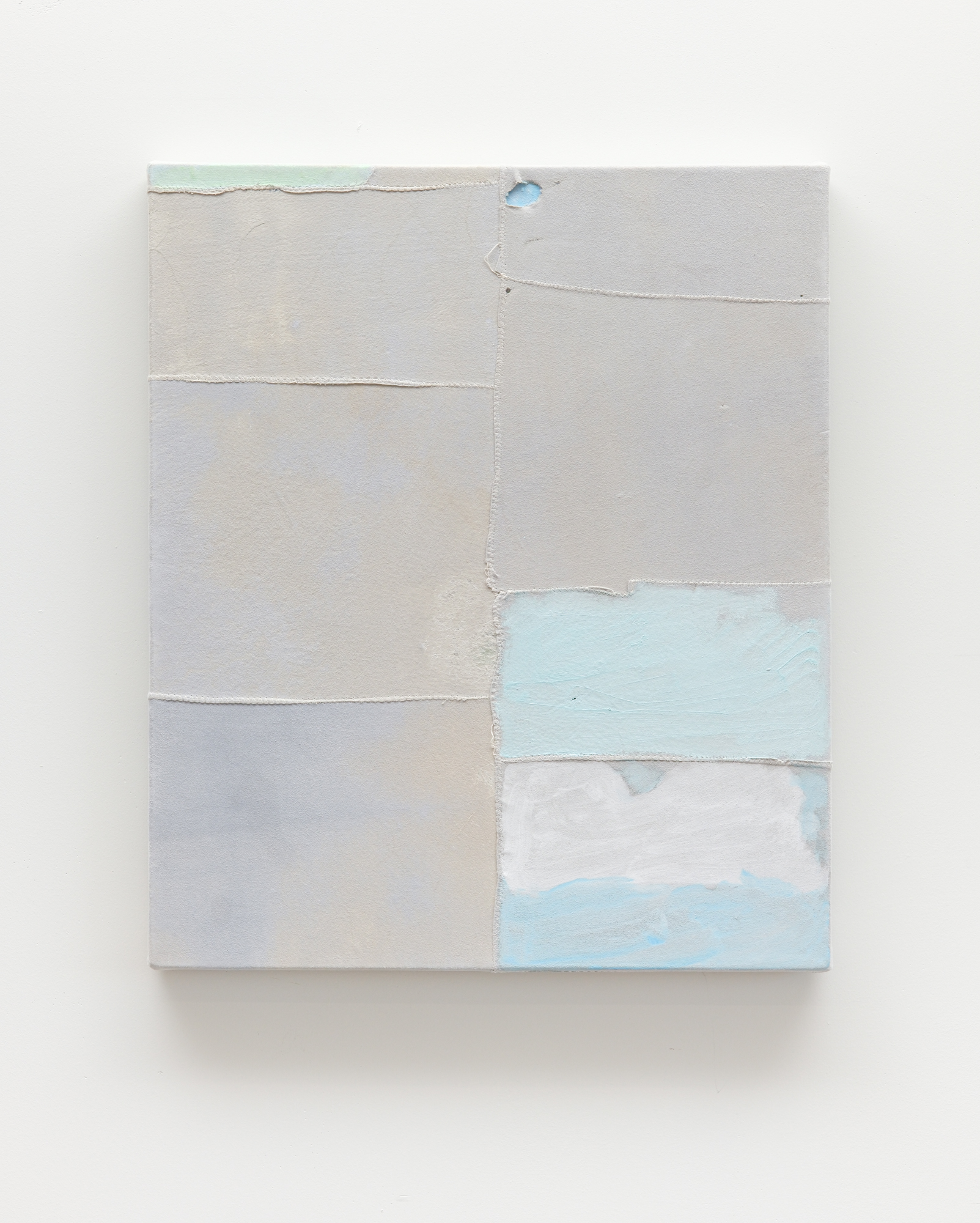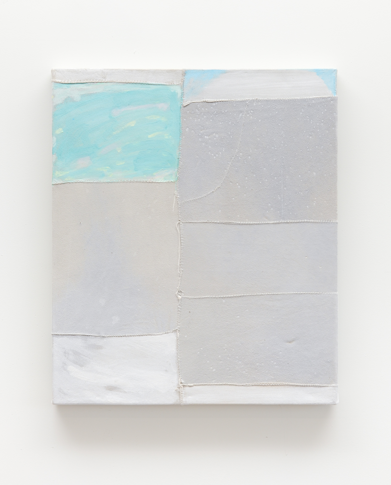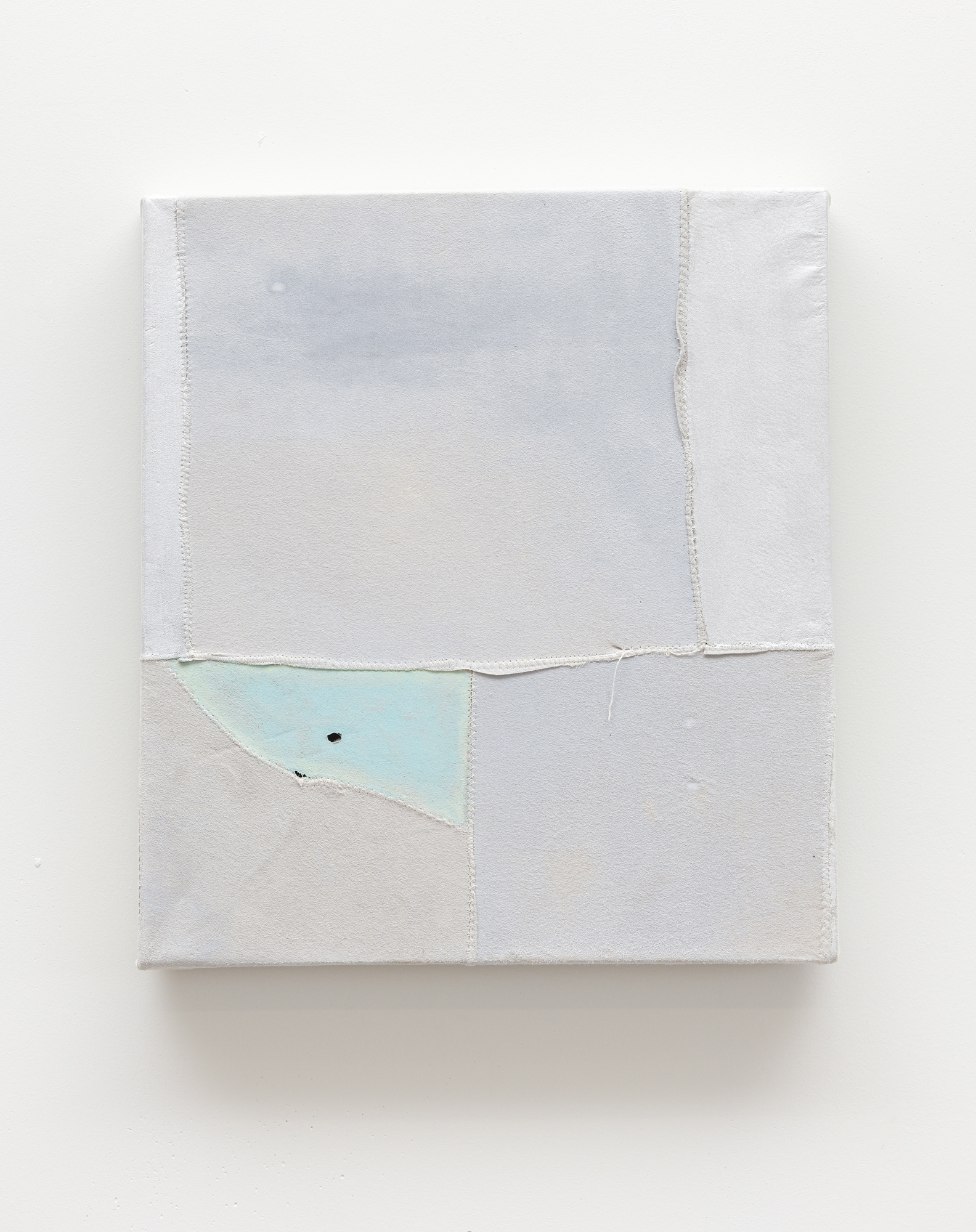 Watercolour, gouache, rice paste, wax emulsion, and pigment on found chamois suede patchwork,