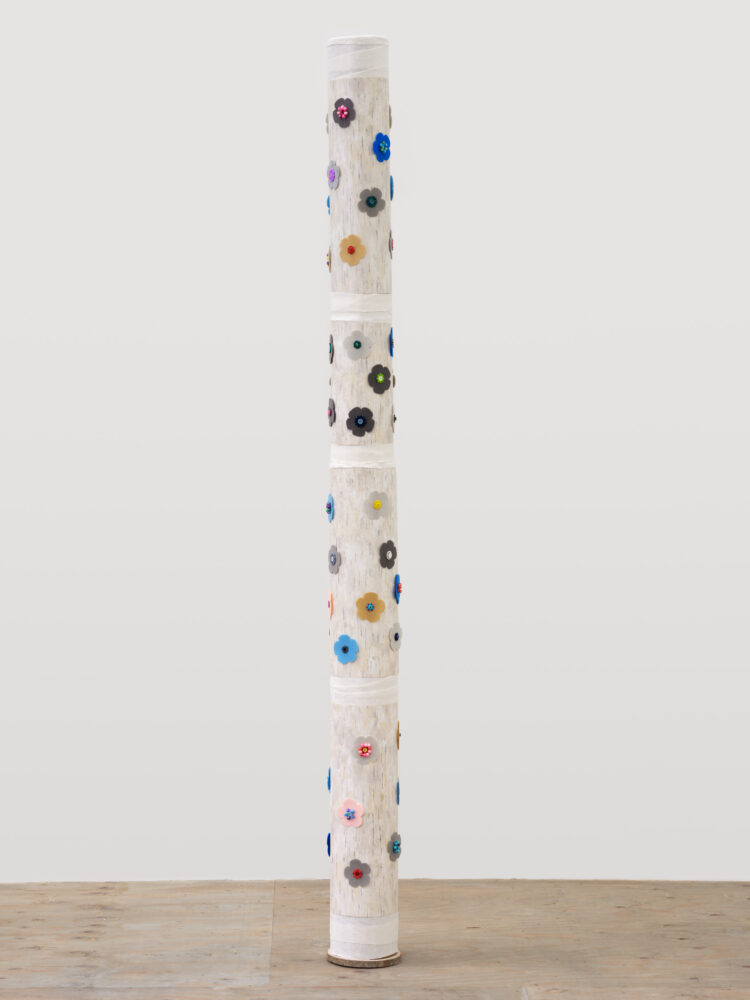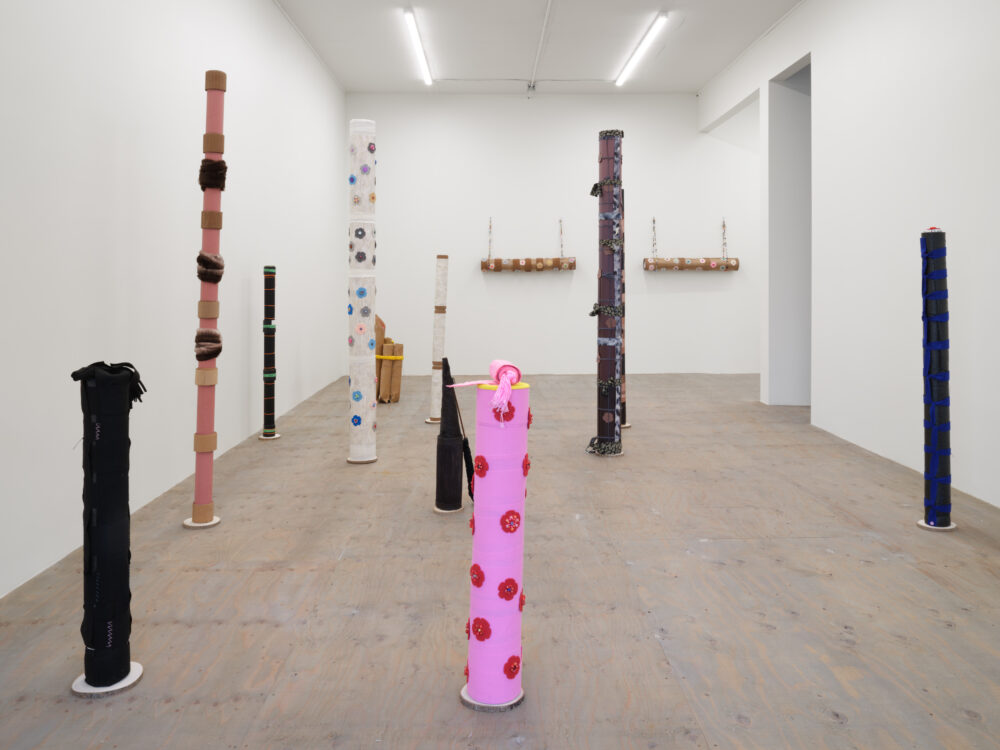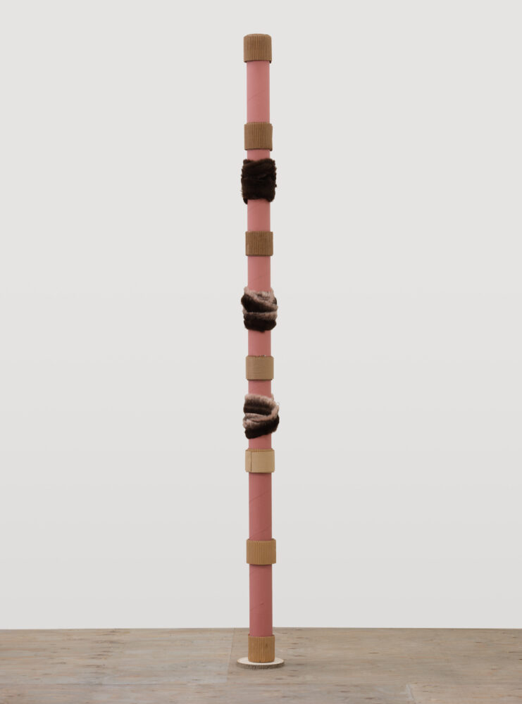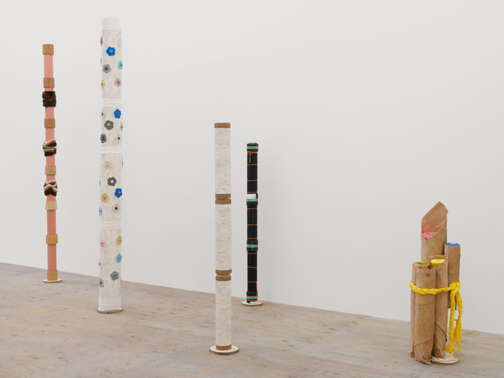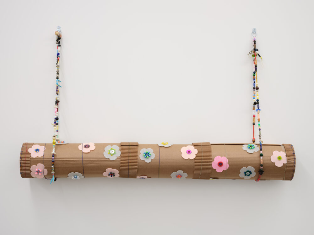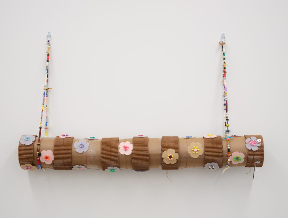 Working with synthetic, store bought materials such as shipping tubes, corrugated cardboard, yarn, beads and craft felt, Vickers explores how the natural world is often reimagined or replaced in contemporary urban life. This playful sense of materiality is also a nod in part to the artist’s longtime reflections on cultural frameworks of beauty and value.